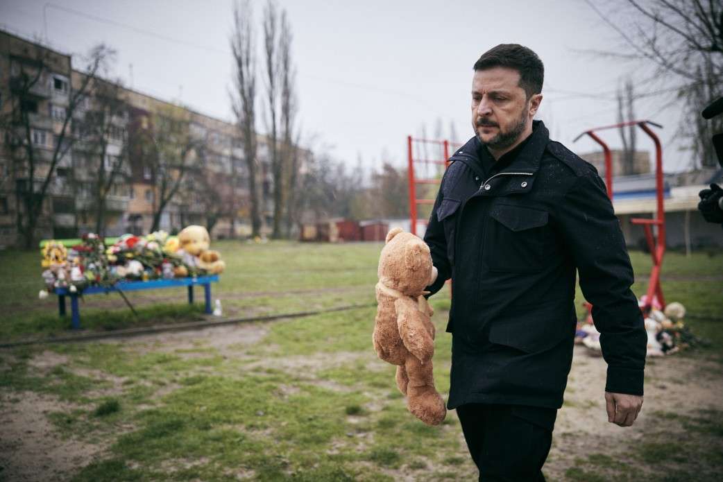 Her deltar Ukrainas president Volodymyr Zelenskyj på ein minneseremoini i heimbyen sin Kruyvyi Rih, etter eit rakettangrep mot ein av byens leikeplassar. 18 personar mista livet i angrepet, ni av dei var barn. Foto: The Presidential Office of Ukraine