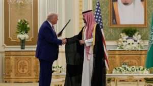 President Donald Trump and Saudi Crown Prince Mohammed bin Salman shake hands after exchanging documents during a signing ceremony at the Royal Palace in Riyadh, Saudi Arabia, Tuesday, May 13, 2025. (AP Photo/Alex Brandon)