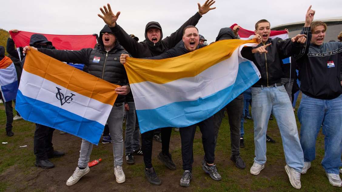 Lenger bak på plassen var stemningen dystrere. Grupper av svartkledde menn kom bærende på bannere fra høyreekstreme bevegelser med navn som Voorpost og Defend Netherlands. Flere viftet med flagg som lignet det nederlandske, men der det røde feltet var byttet ut med oransje. Det såkalte prinseflagget har en lang historie, men det er mest kjent fordi det ble brukt av nasjonalsosialistene på 1940-tallet.