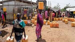 Internally displaced people fetch water inside a camp in the outskirts of Juba, South Sudan, Thursday, Feb. 13, 2025. (AP Photo/Brian Inganga)