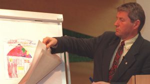 Oslo 19970307: Statsminister Thorbjørn Jagland presenterer Regjeringens langtidsprogram og ideen om Det norske hus. Barnetegninger var med å illustrere. Foto: Helge Hansen, NTB / Scanpix