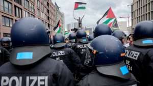 Police officers try to stop people taking part in a pro-Palestinian rally in Berlin, Saturday, May 18, 2024. Police said that thousands of people took part in a pro-Palestinians protest rally in Berlin. (AP Photo/ Ebrahim Noroozi)