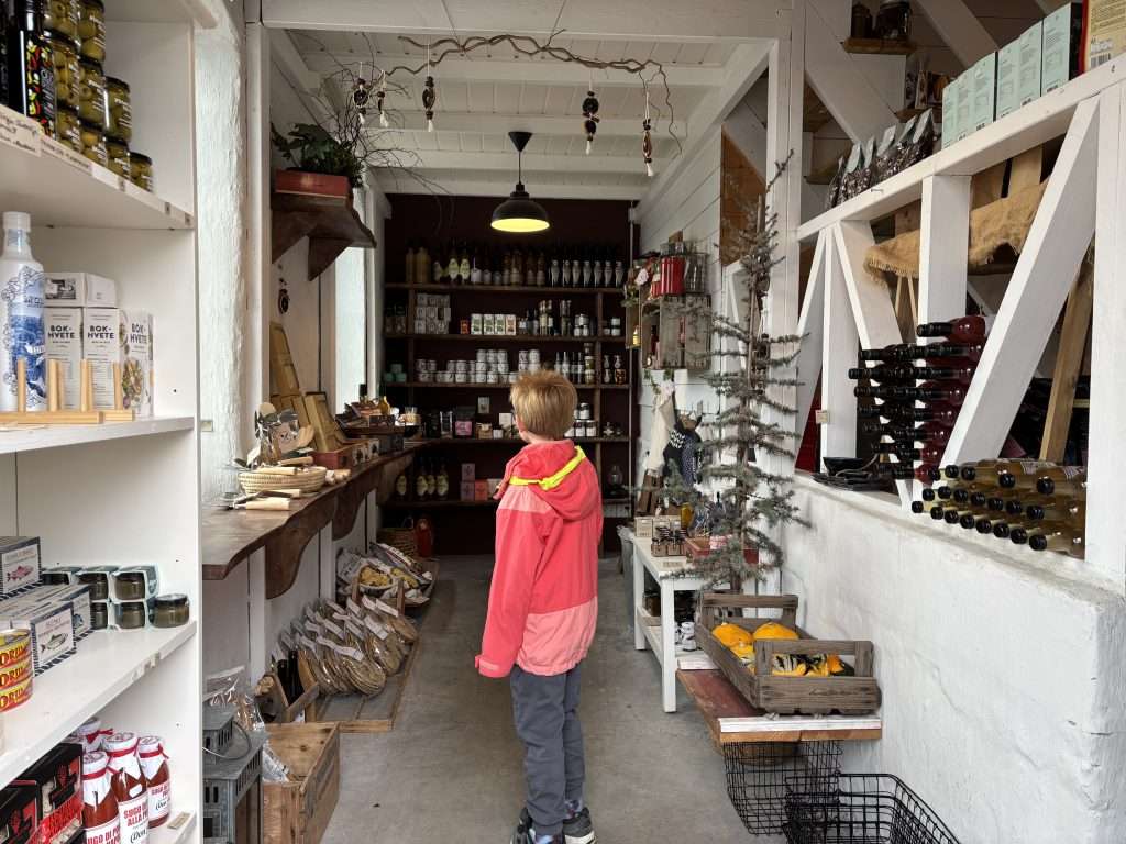 Gårdsbutikken er meieriets rake motsetning. Her er det ikke koselige lokaler med designprodukter, men et stort, åpent rom med grønnsakskasser plassert i midten, nesten nakne vegger, et kjølerom og en disk med selvbetjent kasseapparat. Butikken er riktig nok kameraovervåket, men det er likevel noe fint med denne tillitsbaserte måten å handle på.