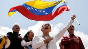 Opposition leader Maria Corina Machado waves a Venezuelan national flag during a rally to protest official results that declared President Nicolas Maduro the winner of the July presidential election, in Caracas, Venezuela, Saturday, Aug. 17, 2024. (AP Photo/Cristian Hernandez)