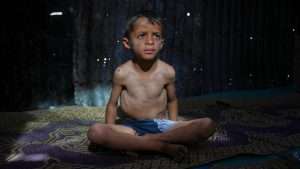 Ahmed El-Sheikh Eid, 7, who shows signs of malnutrition, poses for a photo at his family tent at a camp for displaced Palestinians in Mawasi Khan Younis, Gaza Strip, Friday, May 2, 2025. (AP Photo/Abdel Kareem Hana)