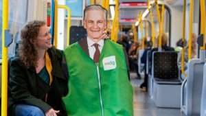 Oslo 20250827. Ingrid Liland i MDG kjører trikk med statsminister Jonas Gahr Støre som pappfigur. Foto: Heiko Junge / NTB