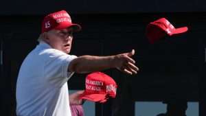 FILE – Former President Donald Trump throws autographed hats to the crowd during the final round of the Bedminster Invitational LIV Golf tournament in Bedminster, N.J., Sunday, Aug. 13, 2023. He’s a criminal defendant, a businessman and a politician. But to his most loyal supporters, Donald Trump will always be Mr. President. When it comes to signaling our political loyalities, language can be just as telling as a MAGA cap, offering a simple by subtle reminder of the false election claims that continue to reverberate online, as well as the polarization that has gripped our politics and divided our people.(AP Photo/Seth Wenig, File)